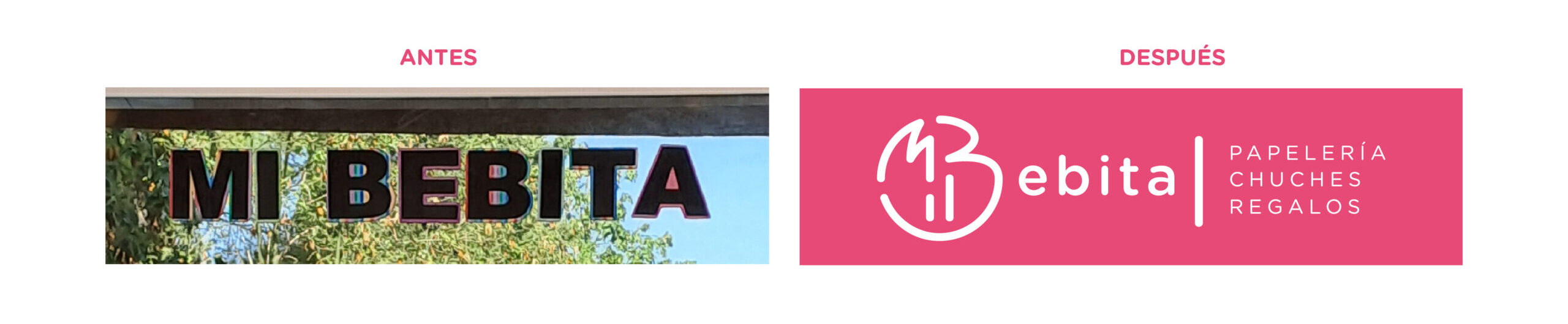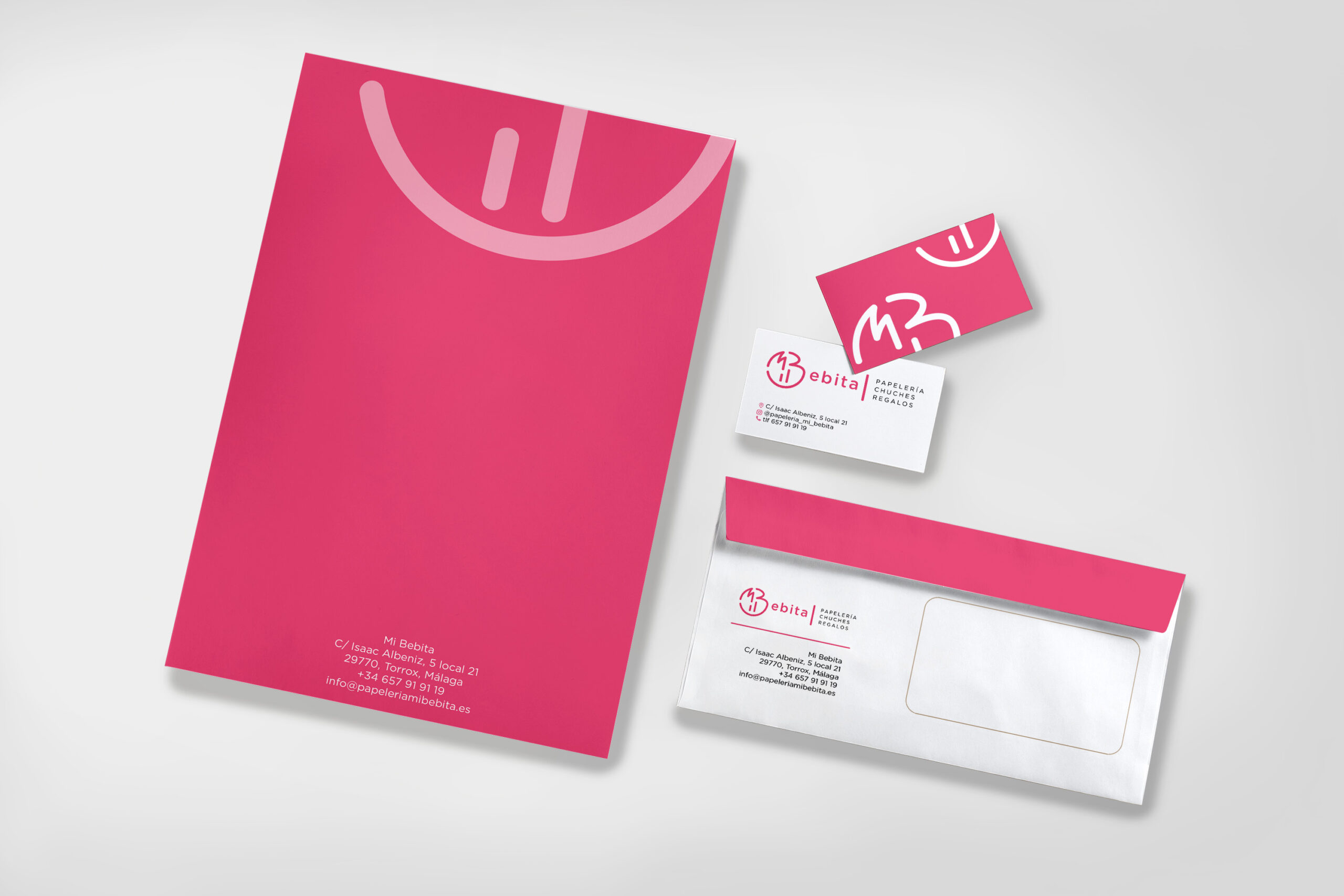 Proyecto de identidad visual para Mi Bebita, un negocio real de chucherías, papelería y artículos de regalo ubicado en Torrox, Málaga.